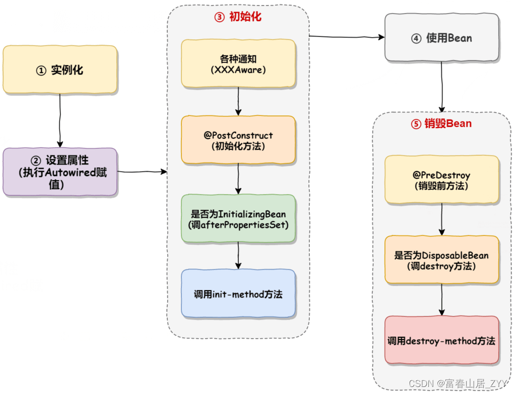 - 初始化:是对 Bean 进行填充的过程,程序员可以进行介入,真正的将 Bean 放到 Spring 容器中