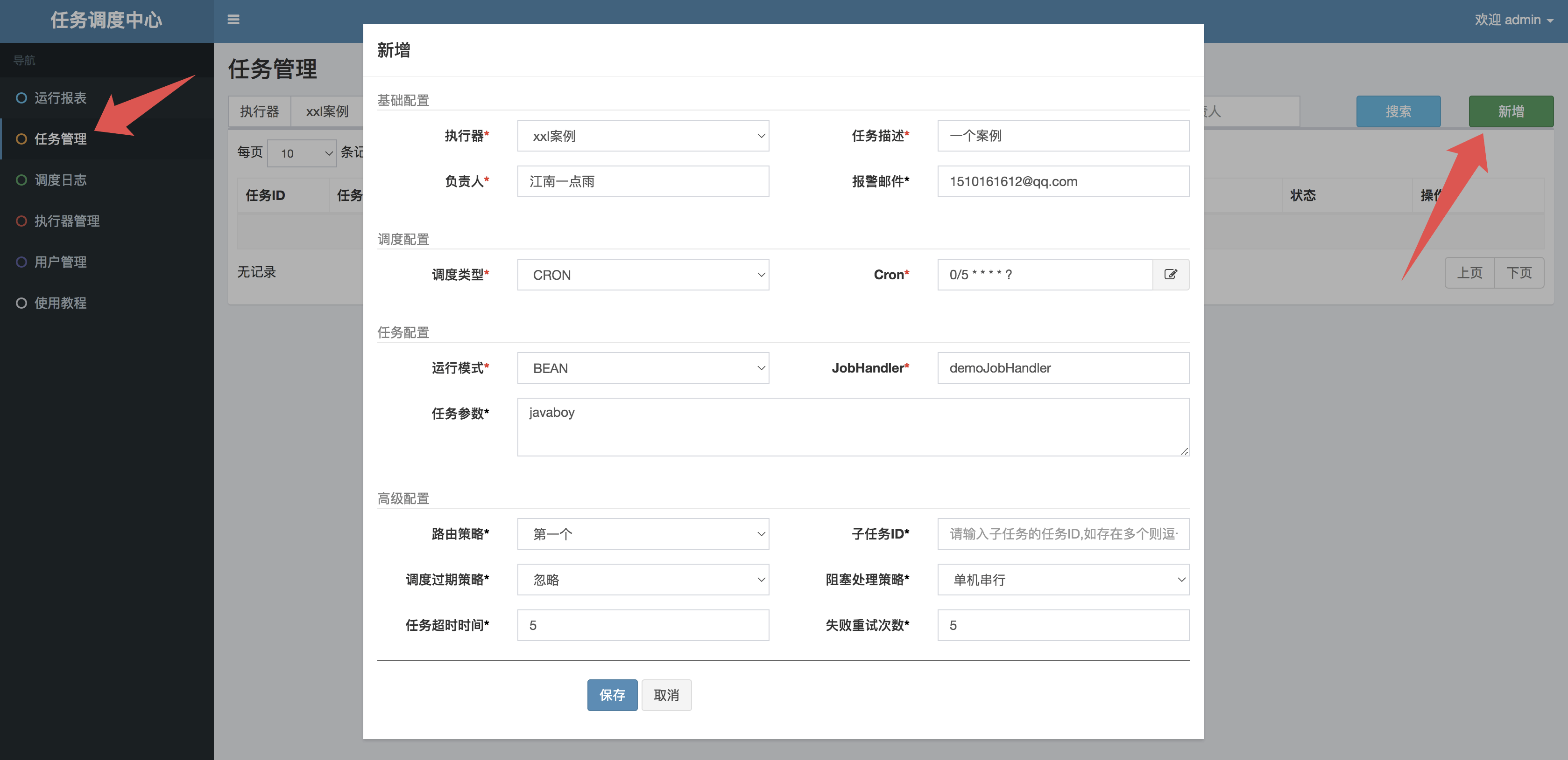 运行模式就选择 BEAN,JobHandler 的值就是我们前面 @XxlJob 注解中填的值,任务参数就是定时任务的方法参数。