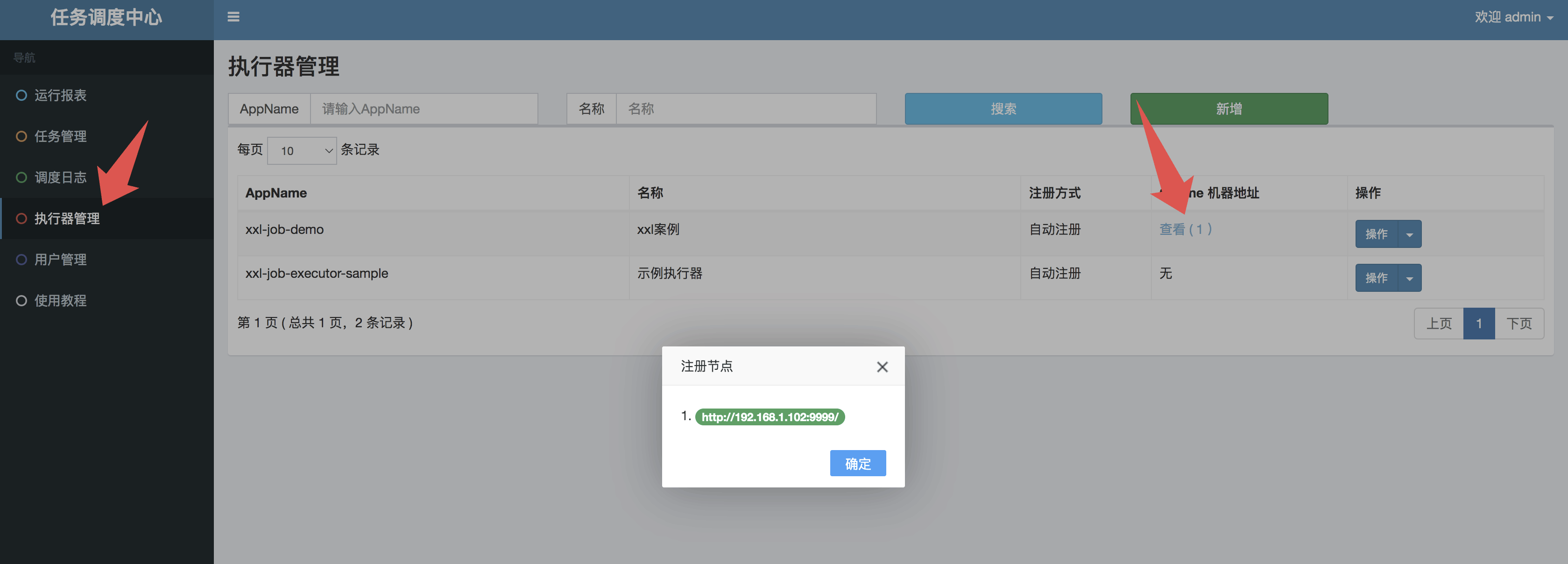 接下来打开配置调度中心,找到执行器管理,点击新增,如下: