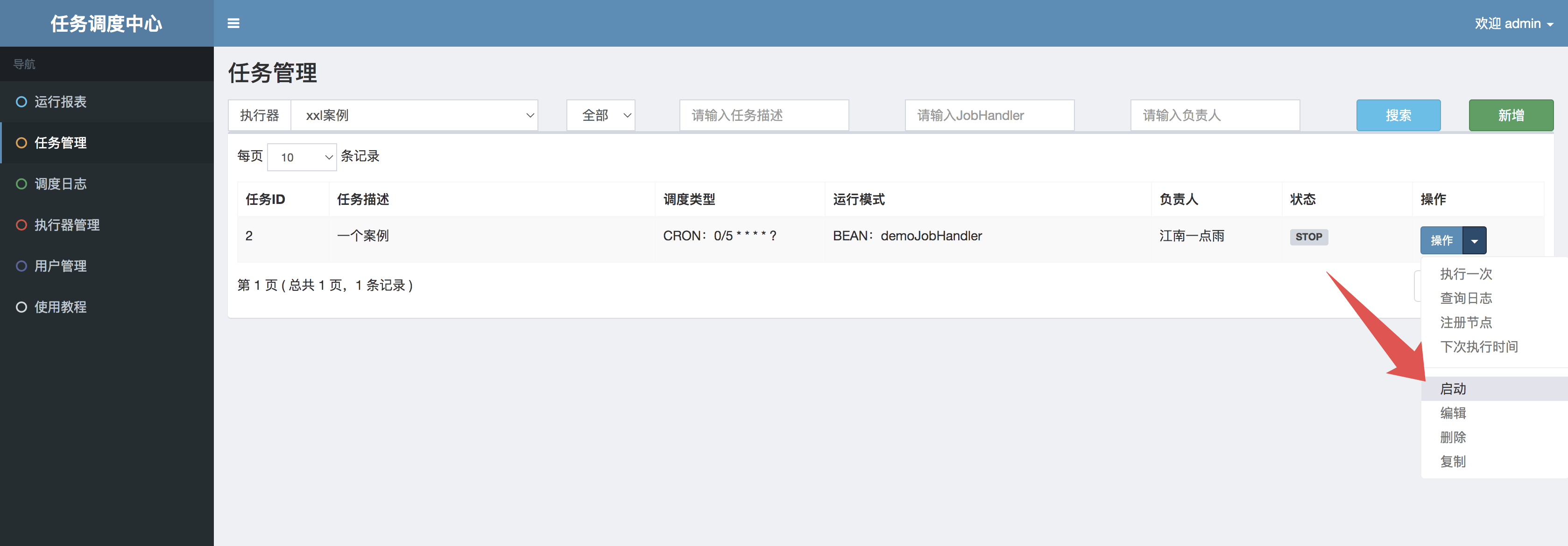 再次回到任务管理,选择启动,就可以开始定时任务的执行了: