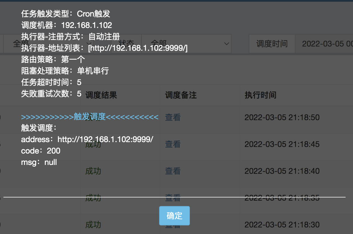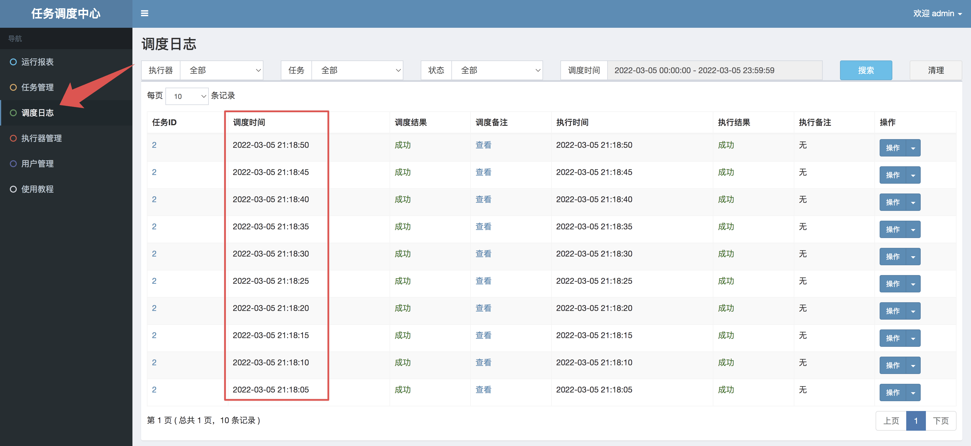 开启之后,点击调度日志,就可以看到我们系统任务执行的详细信息了: