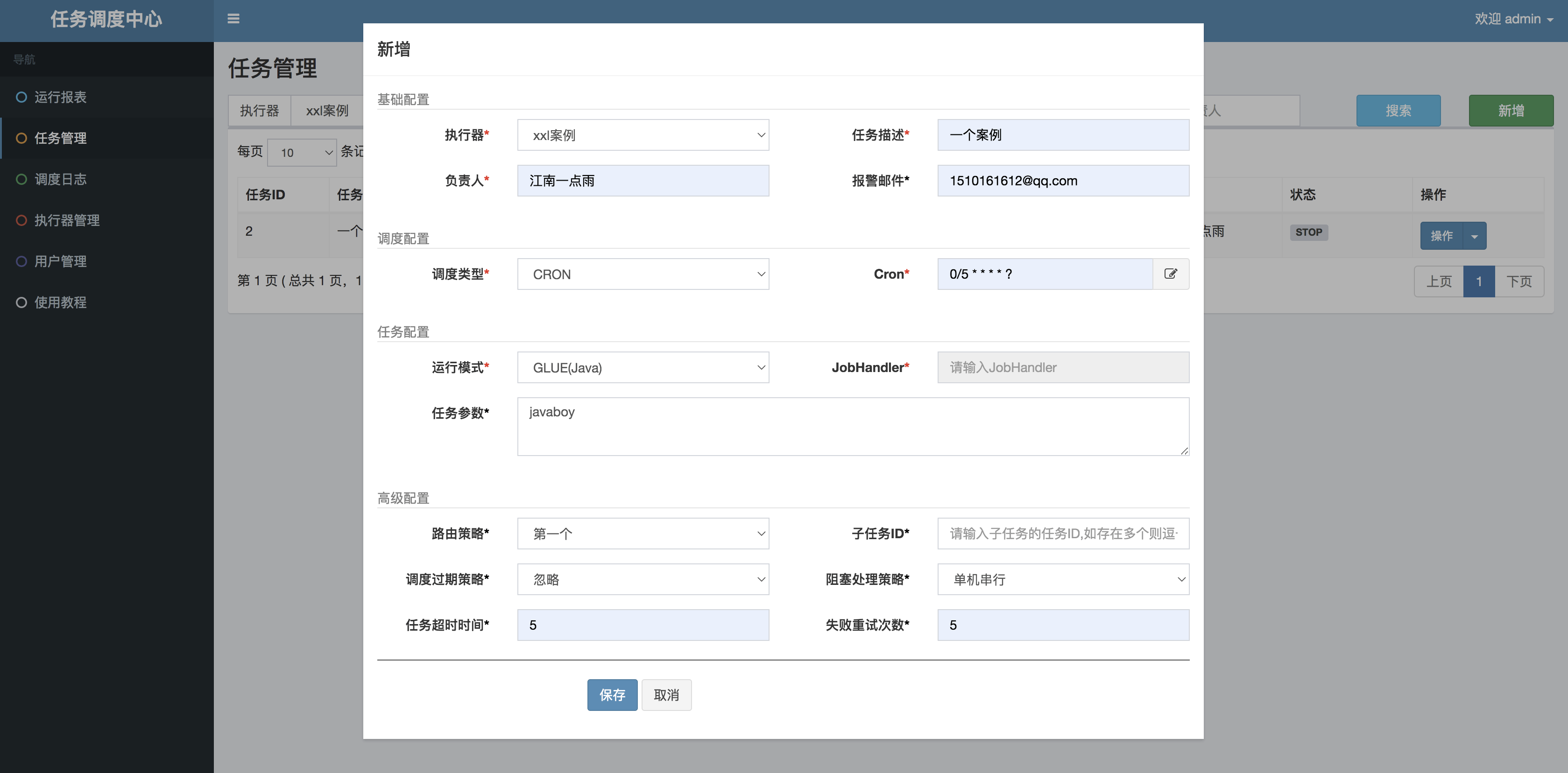 调度中心->任务管理,新建调度任务,新建时选择 “GLUE模式(Java)”: