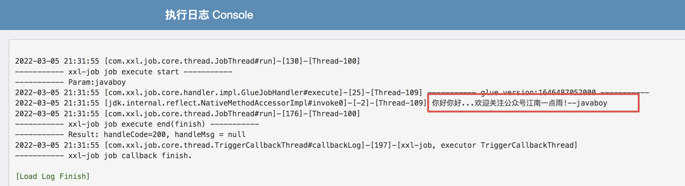 在这个过程中,我们需要通过 XxlJobHelper.log 打印执行日志。