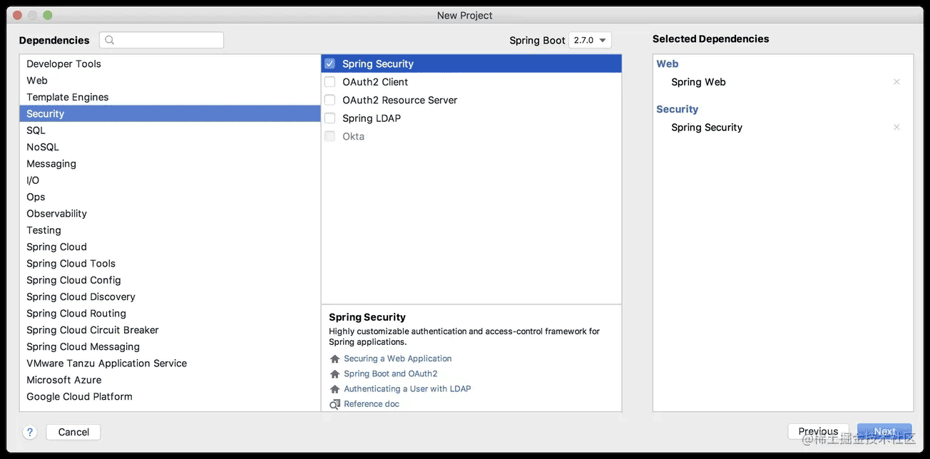 首先我们新建一个 Spring Boot 工程,引入 Web 和 Spring Security 依赖,注意 Spring Boot 选择最新的 2.7。