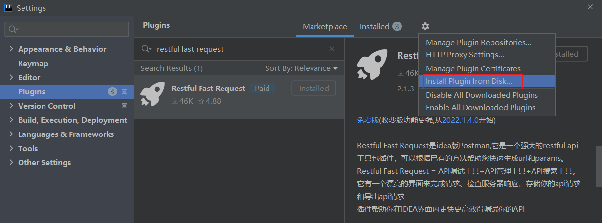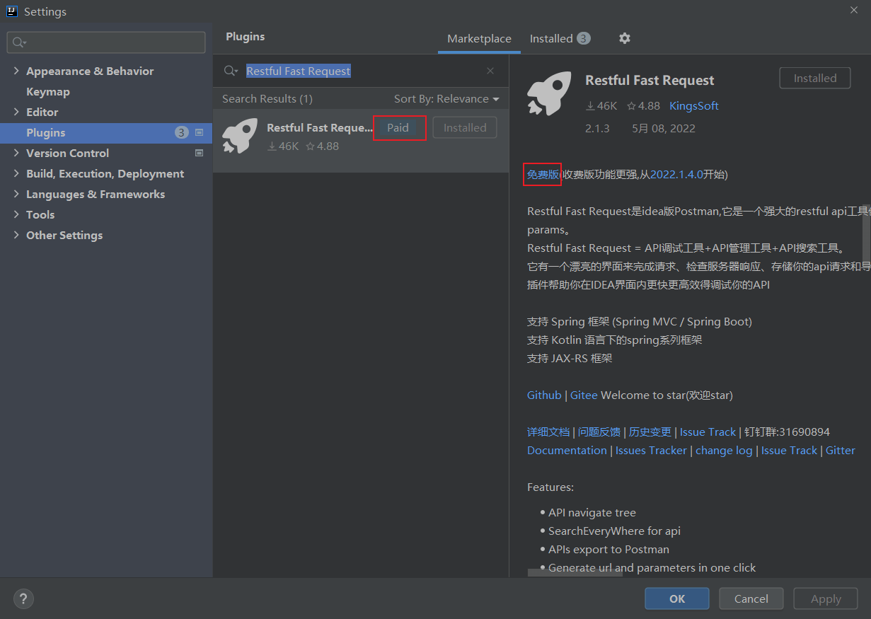 我们可以打开IDEA的插件市场来搜索下RestfulFastRequest,看起来貌似是付费的插件,仔细看下插件描述可以发现,它是有免费版本的,看来作者还是比较良心的!