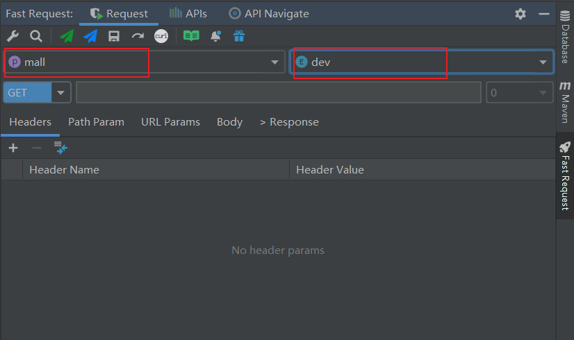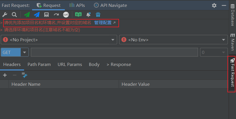 创建项目和环境 点击IDEA右侧的FastRequest按钮即可打开该插件面板,第一次使用需要先配置项目名和环境名;