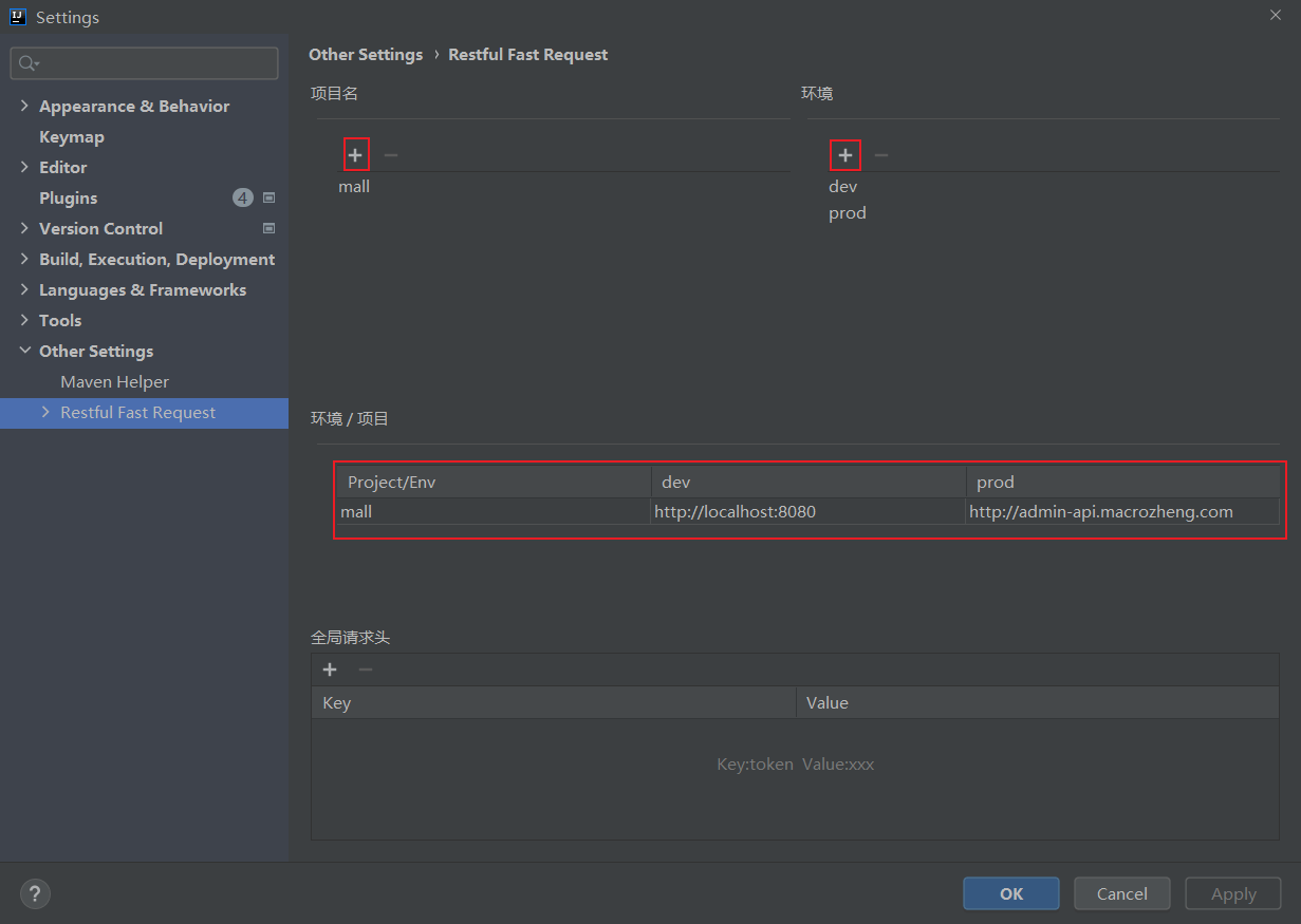 点击管理配置按钮进行配置,配置好项目名,还有环境名,这里配置了dev和prod两个环境的访问地址;