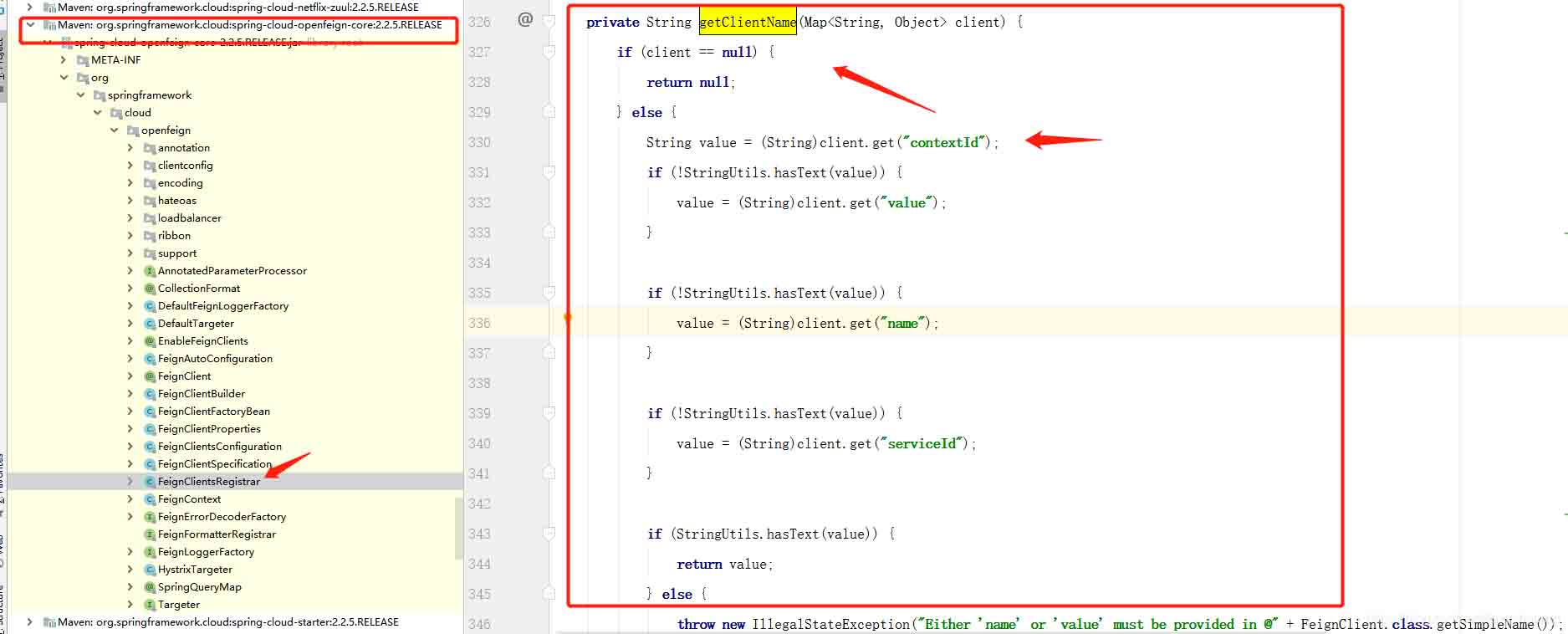 contextId在Feign Client的作用是在注册Feign Client Configuration的时候需要一个名称,名称是通过getClientName方法获取的