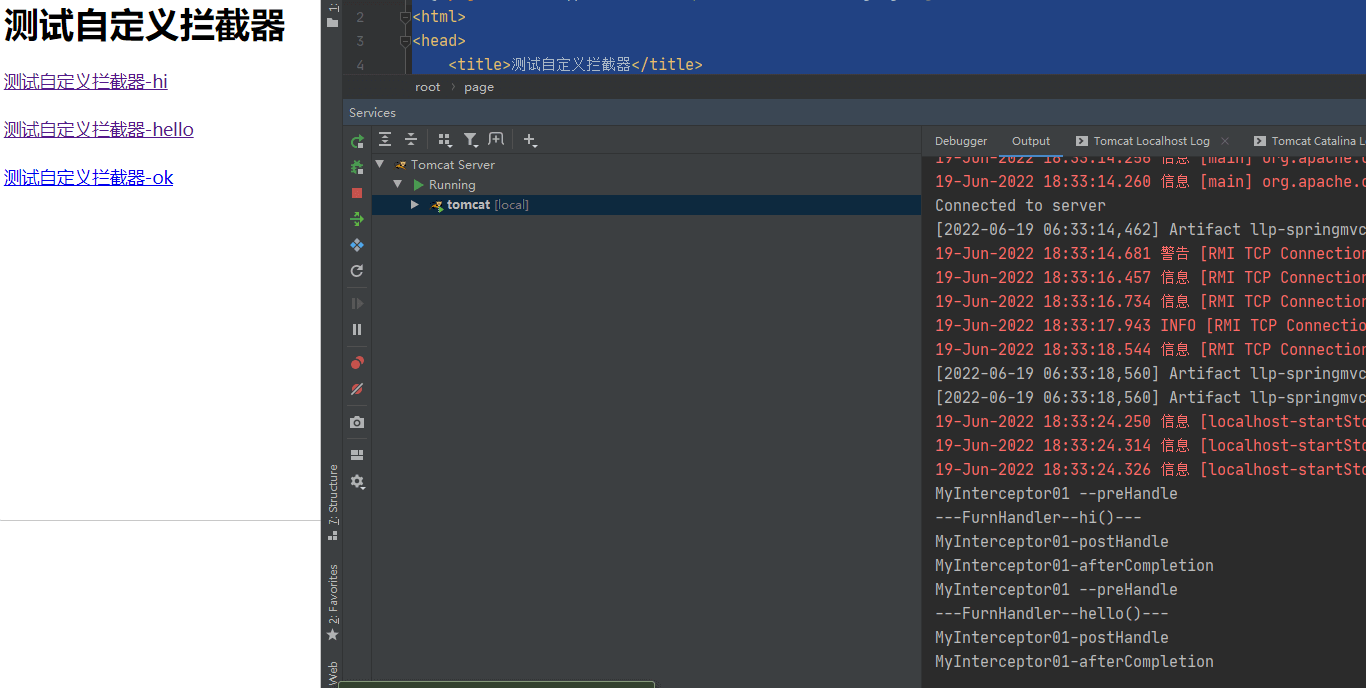 这里我们定义了两个拦截器myInterceptor01和myInterceptor02,两个拦截器都会对ip:port/工程路径/hi的请求进行拦截,执行结果如下图所示: