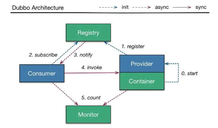服务启动的时候,Provider和Consumer根据配置信息,连接到注册中心Register,分别向注册中心注册和订阅服务;