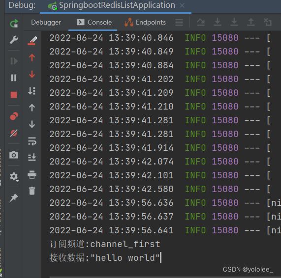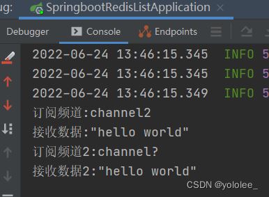 redisTemplate.convertAndSend("channel_first", "hello world");
