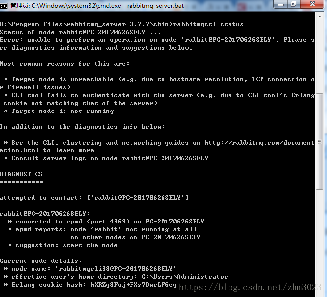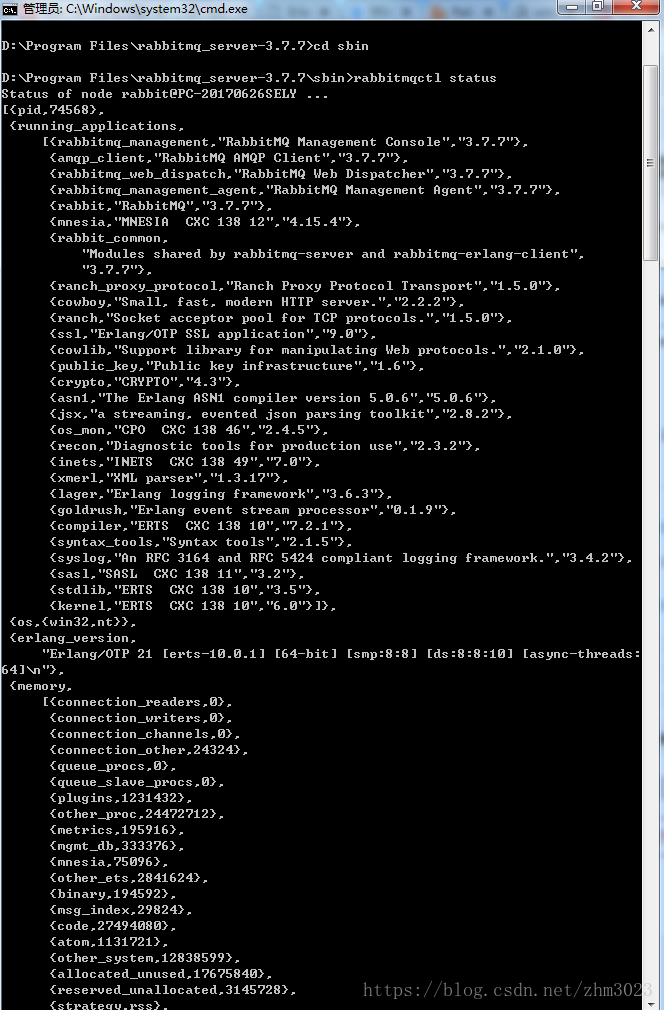 打开cmd命令框,切换至D:Program Files abbitmq_server-3.7.7sbin目录下,输入rabbitmqctl status