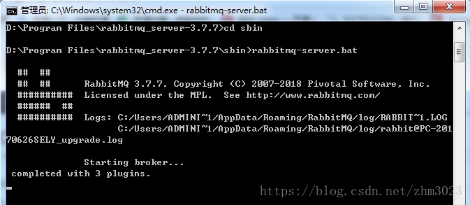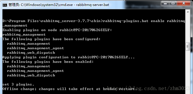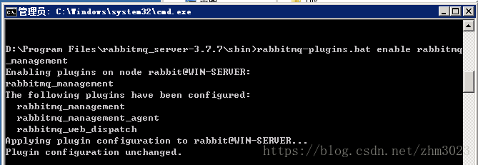 安装插件,命令:rabbitmq-plugins.bat enable rabbitmq_management,出现: