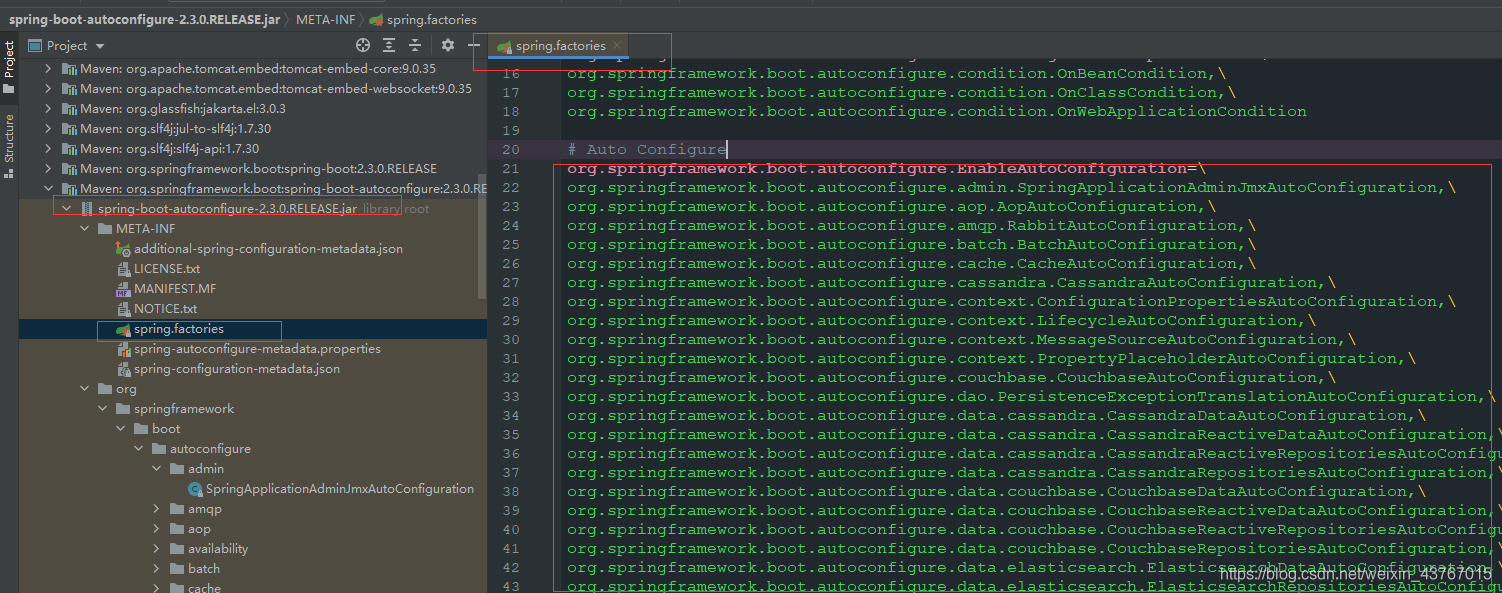 而在AutoConfigurationImportSelector类中再借助SpringFactoriesLoader工具类获取所有引入的jar包中和当前类路径下的META-INF/spring.factories文件。