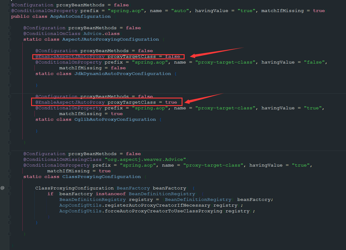比如AopAutoConfiguration配置类,这个类用于自动配置Spring AOP的功能。该类被配置到了spring.factories文件中,因此它会在Spring Boot项目启动时被自动加载,而它的内部的@Configuration静态内部类也会跟着加载并且根据@Conditional条件注解选用,我们在这些内部类上面就能看到熟悉的@EnableAspectJAutoProxy注解,而这个注解就用于开始Spring AOP注解支持。