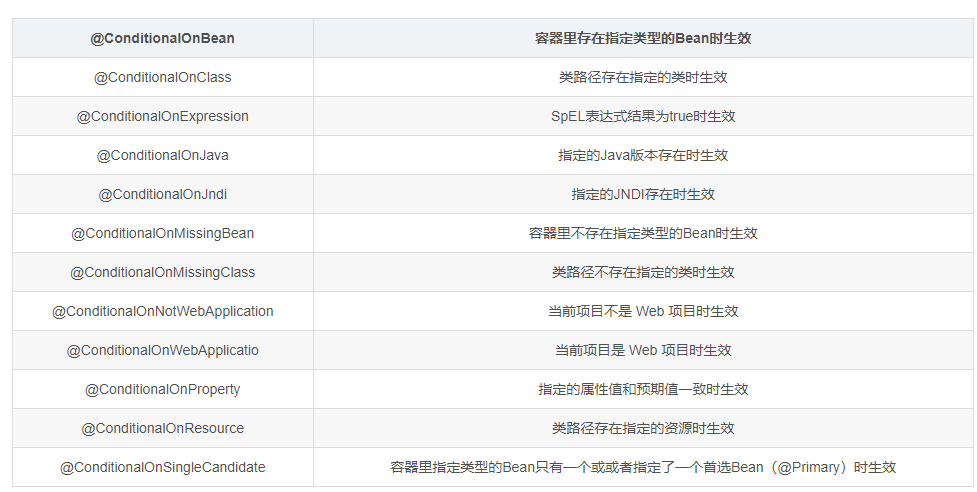 spring-boot-autoconfigure包中提供了一系列的@Conditional注解的衍生注解,它们已被标注在各种自动配置类上,当条件满足时,就会进行自动配置。我们也可以直接使用,常见的@Conditional系列注解如下: