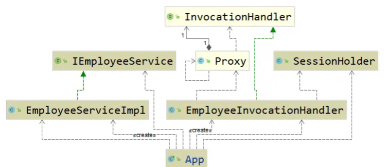 还是原来的需求,前面的IEmployeeService EmployeeServiceImpl SessionHolder 都没变,新加一个JDK代理控制器-EmployeeInvocationHandler