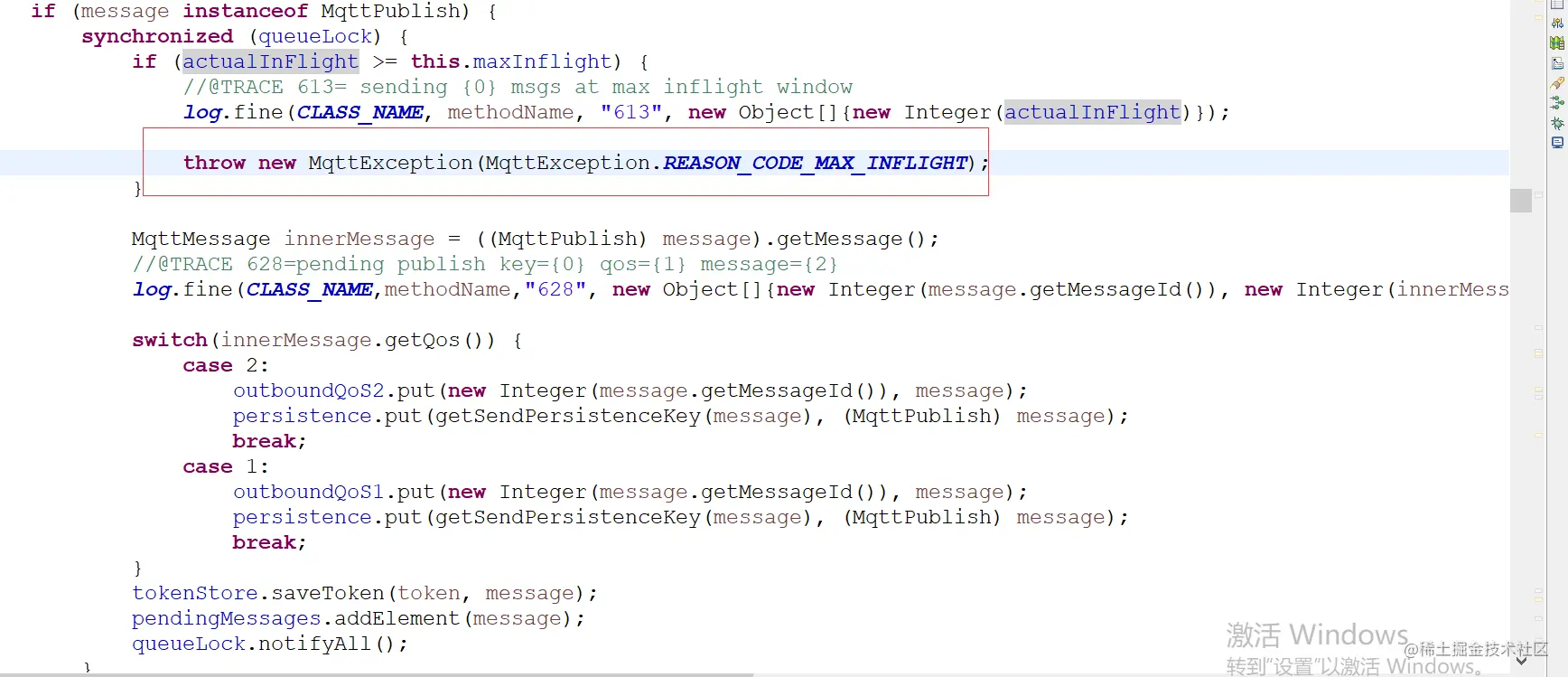 在高并发的场景下,pendingMessage可能会添加多条数据,Qos设置为0的时候,存入tokens(Hashtable)中的key一直是0,当执行tokenStore.getToken在发送方法之后会remove所有数据,由于tokenStore中已经不存在值,因为已经被上一次已经全部remove了,当再次getToken的消息时获取会为空,不在发送信息,使得actualInFlight没有递减,所以才经过一段时间后actualInFlight就会超出设置最大值,从而报错。