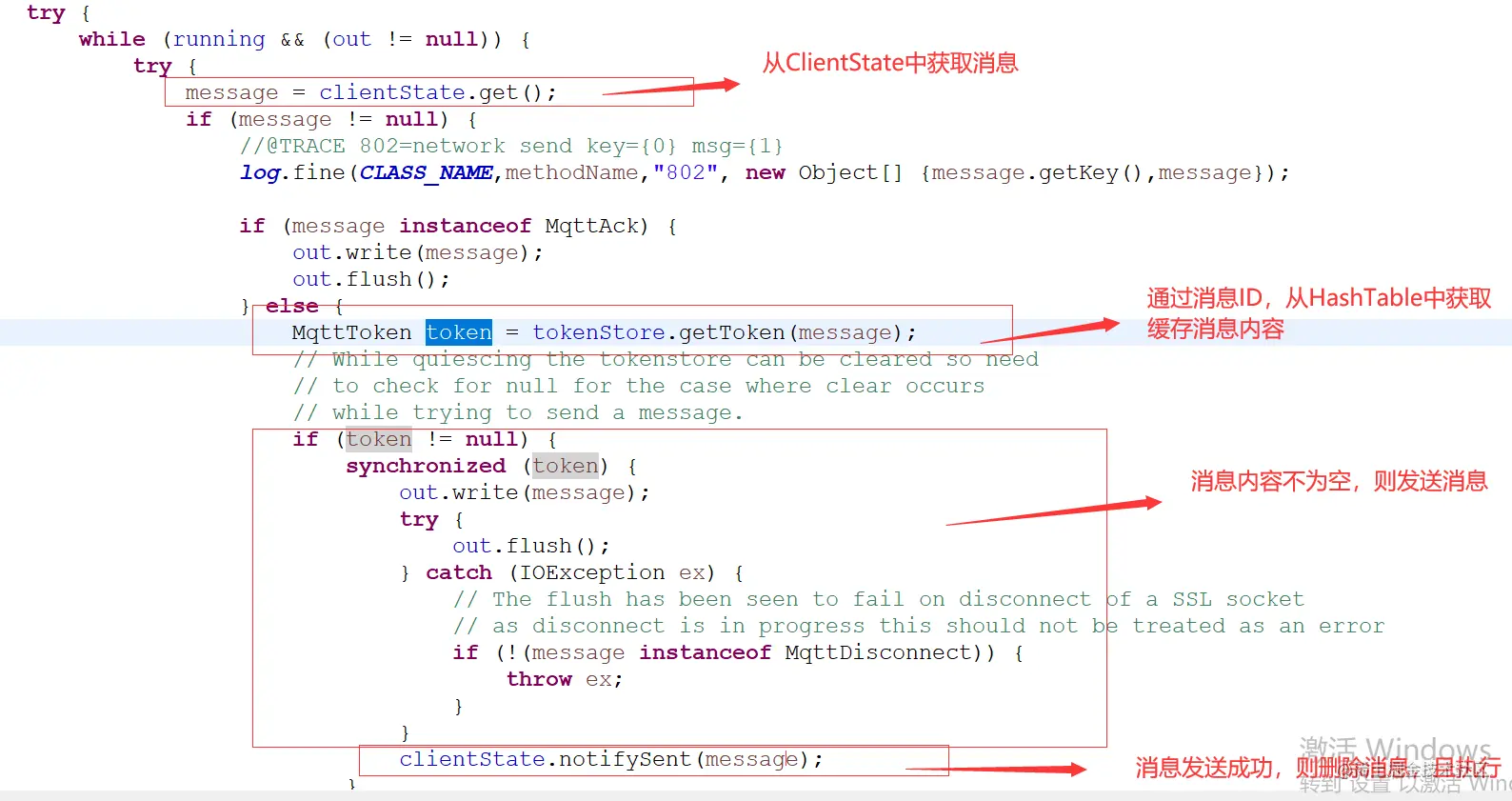 1.从clientState中获取消息 2.通过消息id去hashtable中获取缓存消息 3.消息不为空,执行消息发送 4.调用notifySent方法删除消息,且actualInFlight执行递减操作。