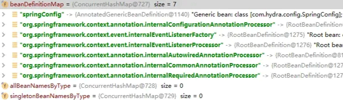 执行完这一步后,可以看到我们的配置类也被放入了beanDefinitionMap,到这里,spring的工厂初始化工作就完成了。