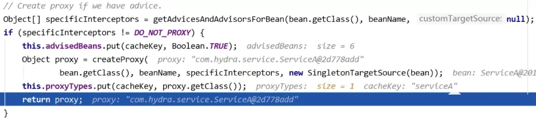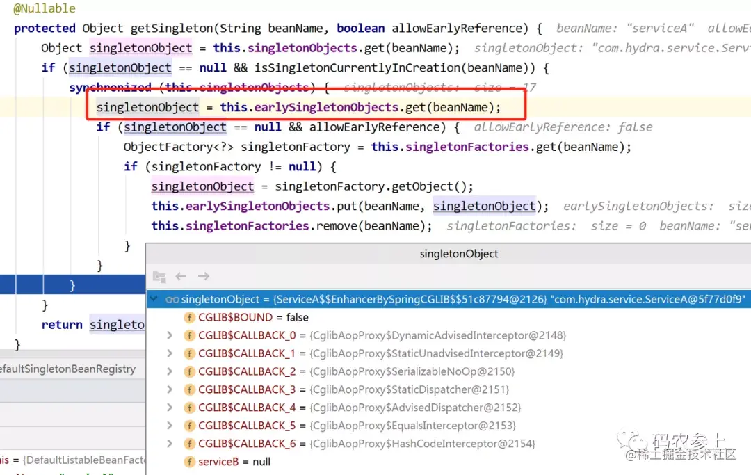 前面的流程和不使用aop相同,我们运行到serviceB需要注入serviceA的地方,调用getSingleton