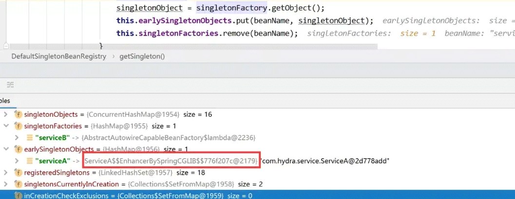 可以看到,二级缓存中的serviceA已经是被cglib代理过的代理对象了,当然这时的serviceA还是没有属性值填充的。