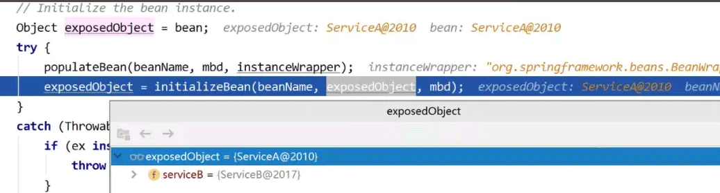 需要注意的是,这个方法中最终返回的还是原始对象,而不是aop后的代理对象。执行到这一步,我们先看一下嵌套的状态: