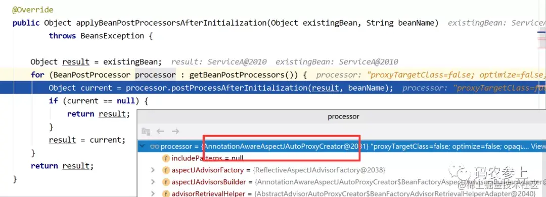 那么这里又会有一个问题,我们之前讲过,在填充完属性后,会调用后置处理器中的方法,而这些方法都是基于原始对象的,而不是代理对象。