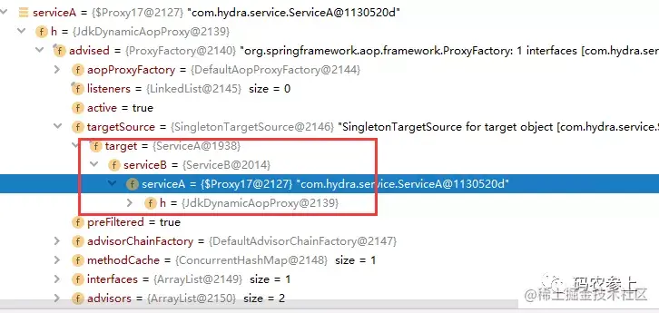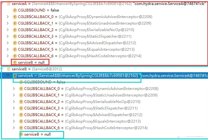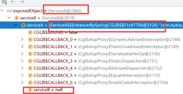 代理对象中,serviceB属性值并没有被填充,只有serviceB中serviceA的属性填充成功了。