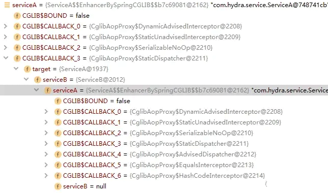 Field h = serviceA.getClass().getDeclaredField("CGLIB$CALLBACK_0");