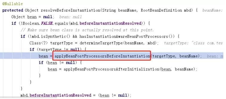 applyBeanPostProcessorsBeforeInstantiation方法: