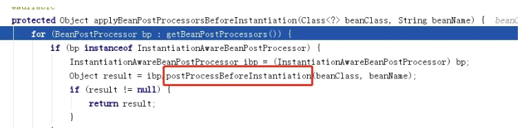 在这里,首先拿到spring中提供的所有后置处理器,判断是不是InstantiationAwareBeanPostProcessor。该后置处理器实现了BeanPostProcessor,在这调用了postProcessBeforeInstantiation方法。