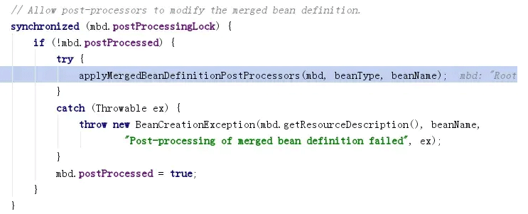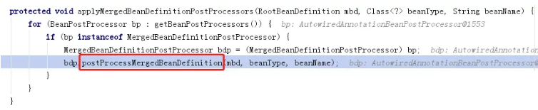 在方法中对所有实现了MergedBeanDefinitionPostProcessor接口的后置处理器进行遍历,这里具体调用AutowiredAnnotationBeanPostProcessor,用于扫描需要注入的属性。