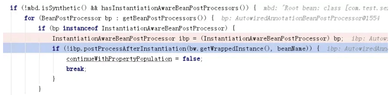 这里遍历后置处理器,如果实现了InstantiationAwareBeanPostProcessor,那么就调用postProcessAfterInstantiation方法。如果方法返回值为true,按照正常流程进行属性值的填充;如果该方法返回false,会忽略属性值的设置过程。简而言之,该后置处理器用于判断当前实例化完成的bean需不需要进行属性填充。