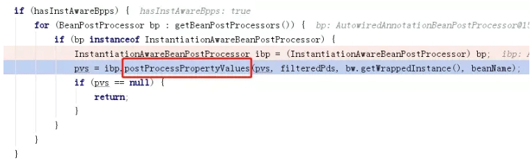 遍历后置处理器,如果属于InstantiationAwareBeanPostProcessor类型,则调用它的postProcessPropertyValues方法。