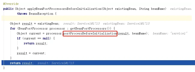 在该方法中,遍历执行所有BeanPostProcessor的postProcessBeforeInitialization方法。