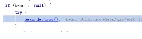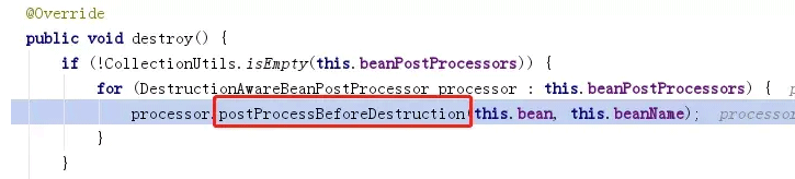 如果当前bean中有方法被@PreDestroy注解标注,那么当Spring的ApplicationContext执行close方法时调用该后置处理器。在DefaultSingletonBeanRegistry中执行destroyBean方法: