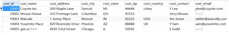INSERT INTO `customer` VALUES (10005, 'gzn or 1=1', '4545 53rd Street', 'Chicago', 'IL', '54545', '', 'E Fudd', NULL);