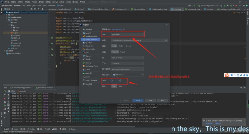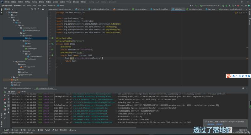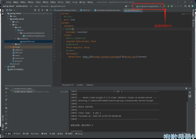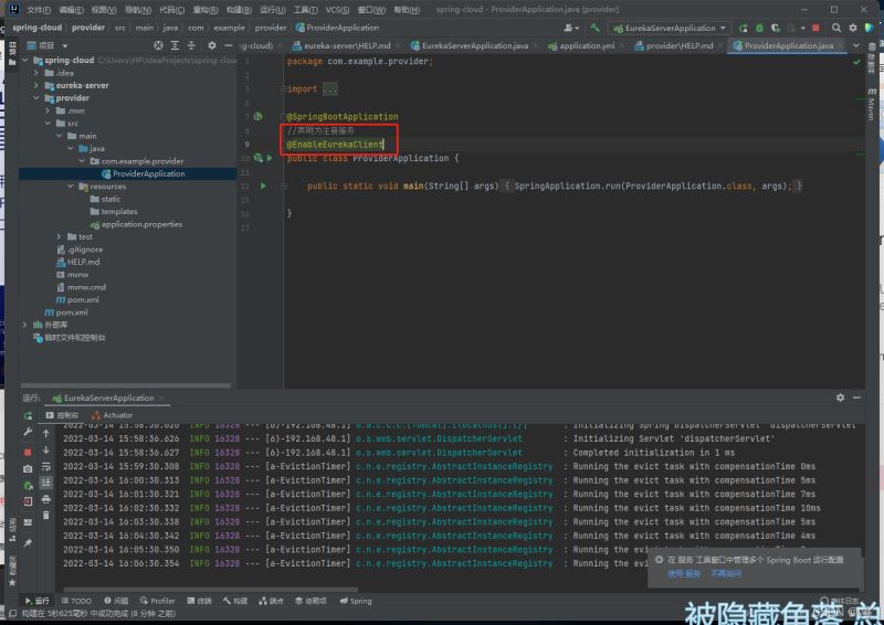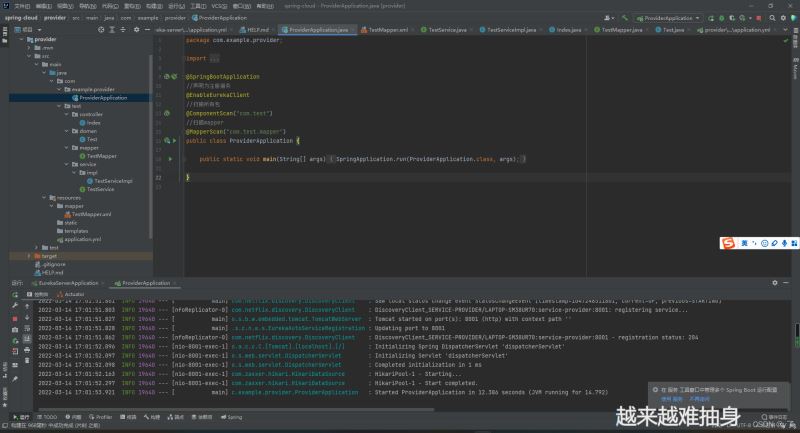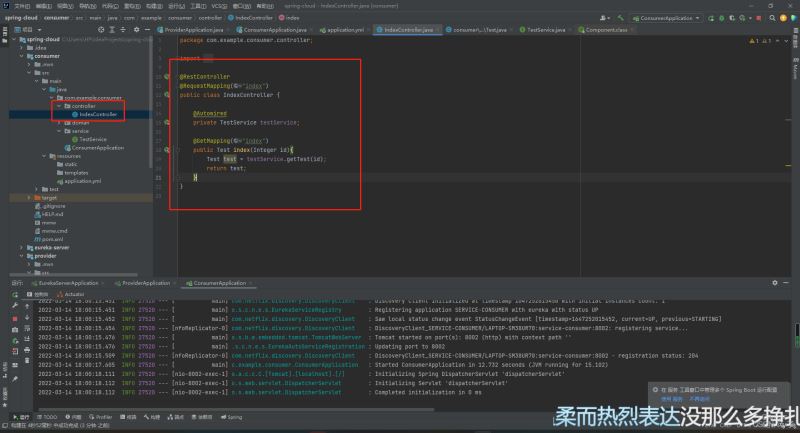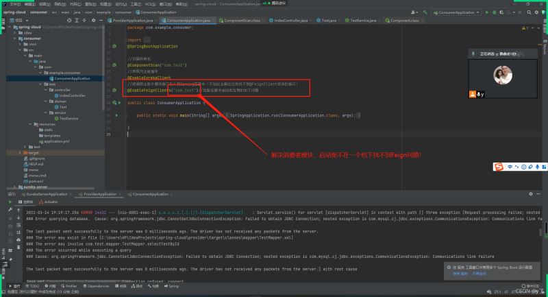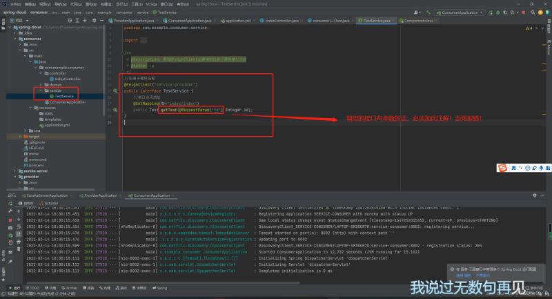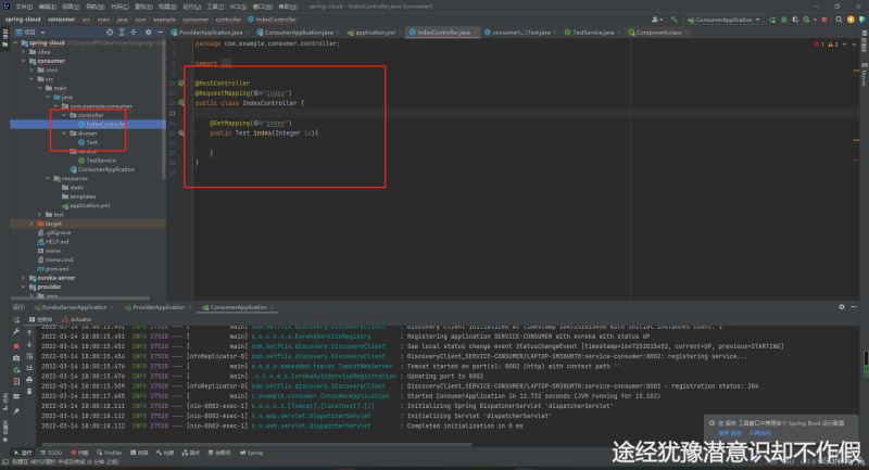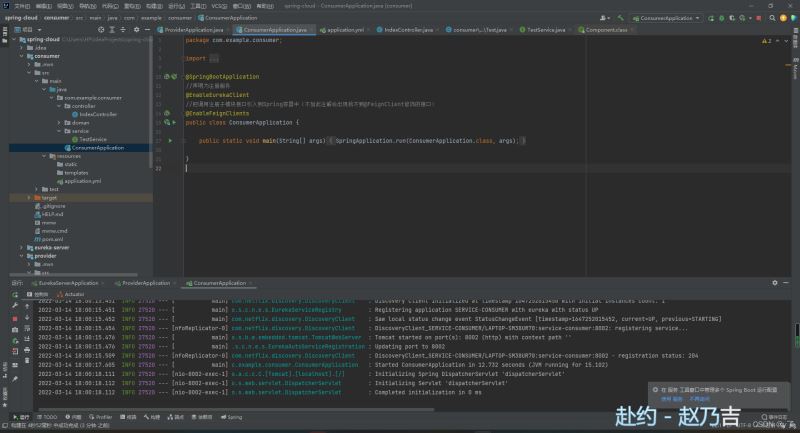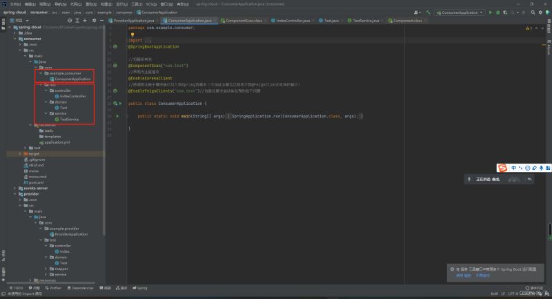 以上就是idea快速部署springCloud的全部过程,其中发现了一个问题,在消费者模块中启动器貌似无法使用@ComponentScan注解扫描包,使用后启动会报错???具有原因没有了解,建议不要把启动类放在别的包。