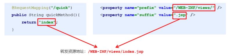 直接返回字符串:此种方式会将返回的字符串与视图解析器的前后缀拼接后跳转。