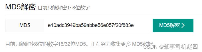 今天看到一篇文章说使用MD5对密码进行加密存储也还不能做到很安全,网上有在线解密MD5的网站,我一搜,还真有。接下来我尝试对我存储在数据库中的密码进行解密操作: