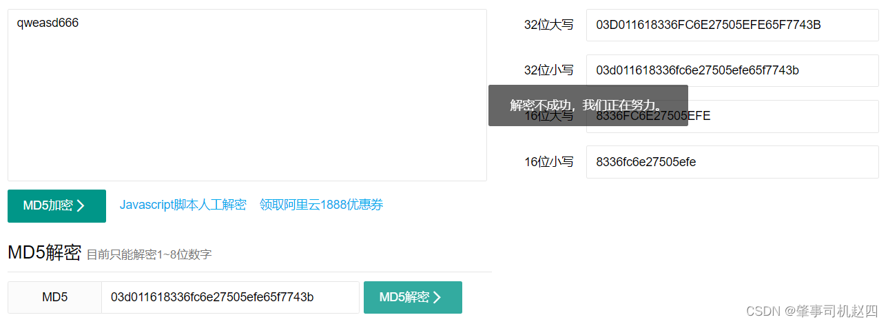 可以看到解密失败,说明其原理就是我们上面所说的收集常用的密文进行一一对应。既然解密失败了,那么说明“qweasd666”这个密码是安全的,你们可以都设置这个密码(doge)。