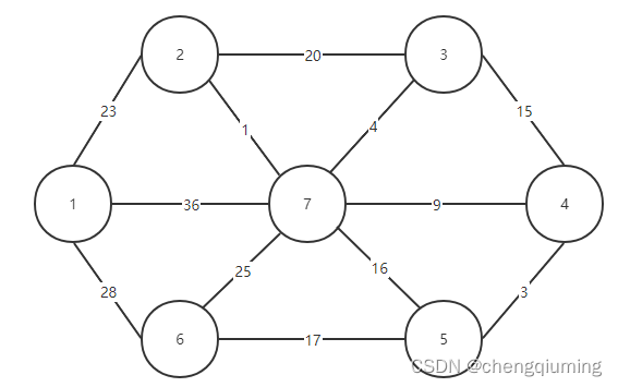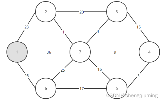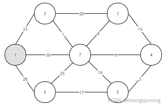 首先任选一个节点,例如节点1,把它放在集合 U 中,U={1},那么剩下的节点为 V-U={2,3,4,5,6,7},集合 V 是图的所有节点集合。