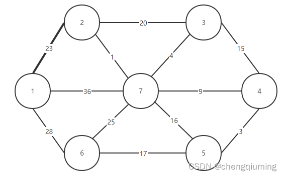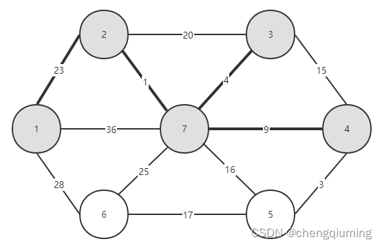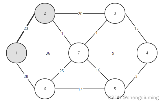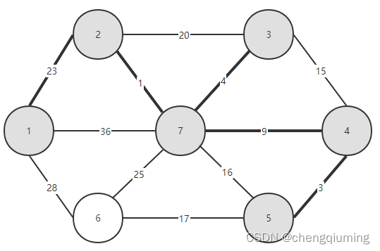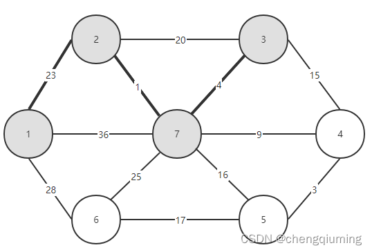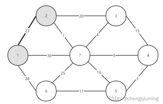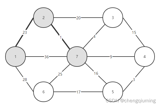 再从连接两个集合(U 和 V-U)的边中选择一条权最小的边。从上图看出,在连接两个集合的4条边中,节点2到节点7的边权值最小,选中这条边,把节点7加入集合U={1,2,7}中,V-U={3,4,5,6}。