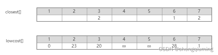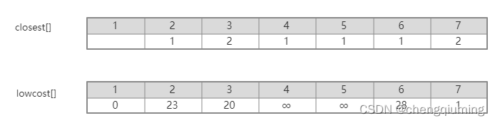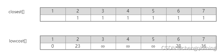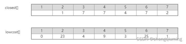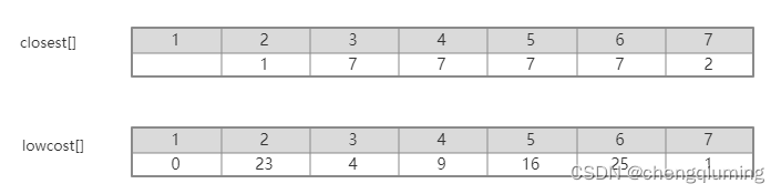 1 初始化。假设 u0=1,令集合 U={1},集合 V-U={2,3,4,5,6,7},s[1]=true,初始化数组 closest[]:除了节点1,其余节点均为1,表示集合 V-U 中的节点到集合 U 的最邻近点均为1.lowcost[]:节点1到集合 V-U 中节点的边值。closest[] 和 lowcost[] 如下图所示。