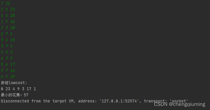 - C[7][4]=4<lowcost[4]=无穷大,更新最邻近距离 lowcost[3]=9,最邻近点 closest[4]=7;