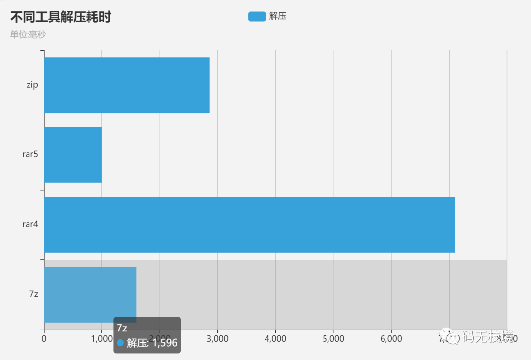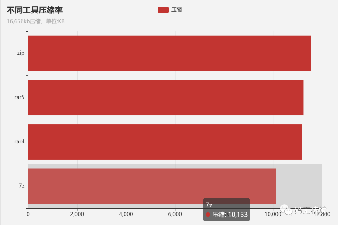 从以上图表可以看到,7z的压缩率是最高,而zip压缩率比较低,rar比zip稍微好点。单纯从压缩率看,7z>rar4>rar5>zip。