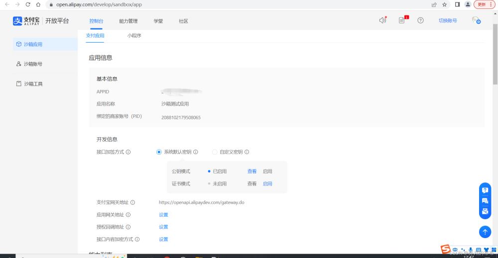 系统密钥,查看公钥模式,merchant_private_key就是应用私钥;alipay_public_key支付宝公钥;支付宝网关地址https://openapi.alipaydev.com/gateway.do因为是沙箱测试环境,这里是dev标识加以区分;签名方式这里是RSA2