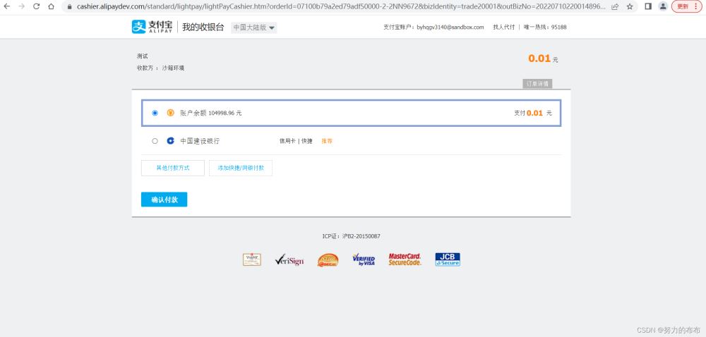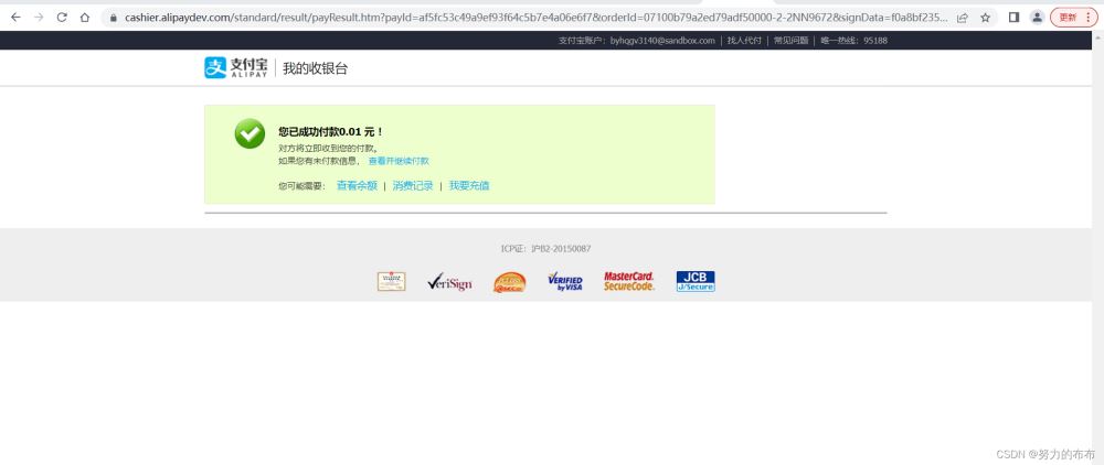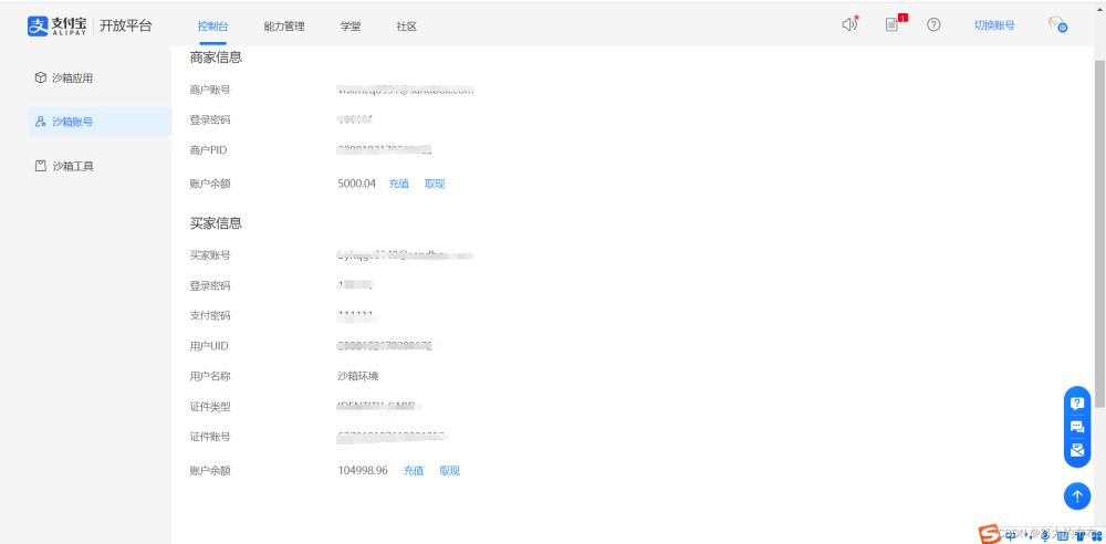 沙箱账号有商家和买家的账号支付密码和余额,后续付款会用得到的