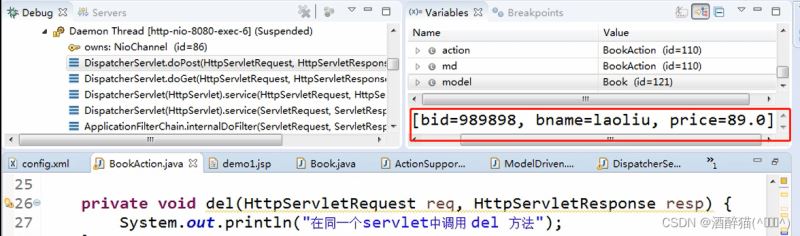 3、再然后进入到BookAction中调用methodname方法,找到对应的返回值,